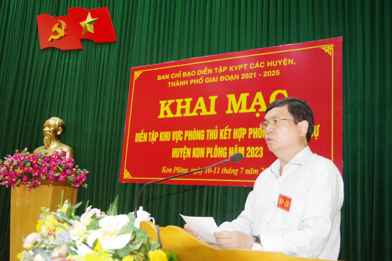 Phát biểu khai mạc, đồng chí Phó Chủ tịch UBND tỉnh, Phó Trưởng Ban Chỉ đạo nhấn mạnh: Đây là dịp để hệ thống chính trị của huyện Kon Plông tổ chức vận hành cơ chế trong xử lý, giải quyết kịp thời các tình huống phức tạp về quốc phòng, an ninh trên địa bàn, những vấn đề mang tính nguyên tắc trong điều chỉnh quyết tâm, xử lý tình huống tác chiến phòng thủ, phòng thủ dân sự trong tình hình hiện nay; thông qua việc vận hành cơ chế, phát huy sức mạnh tổng hợp xây dựng thế trận quốc phòng toàn dân, chiến tranh nhân dân vững chắc và thực hiện tốt quan điểm “độc lập, tự chủ” của Đảng.